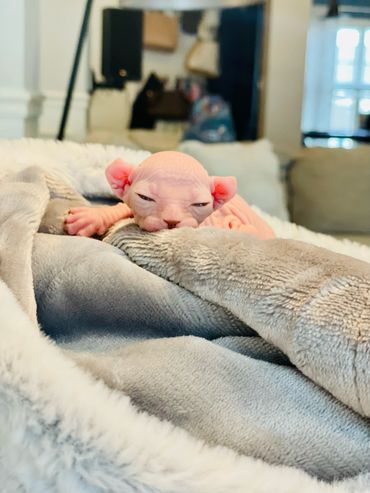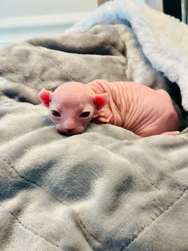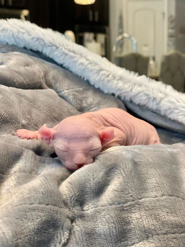 Sphynx cats have a wonderful temperament, and in our experience, love to spend the majority of the day huddled under a blanket or snuggling with each other. Late afternoon and into the evening hours, our Sphynx kitties enjoy spending time with the family, playing, and eating dinner. Some of them love a nice game of fetch, while others like to play with more traditional cat toys. At bedtime, our Sphynxs like to come to bed with us and snuggle close to their humans.